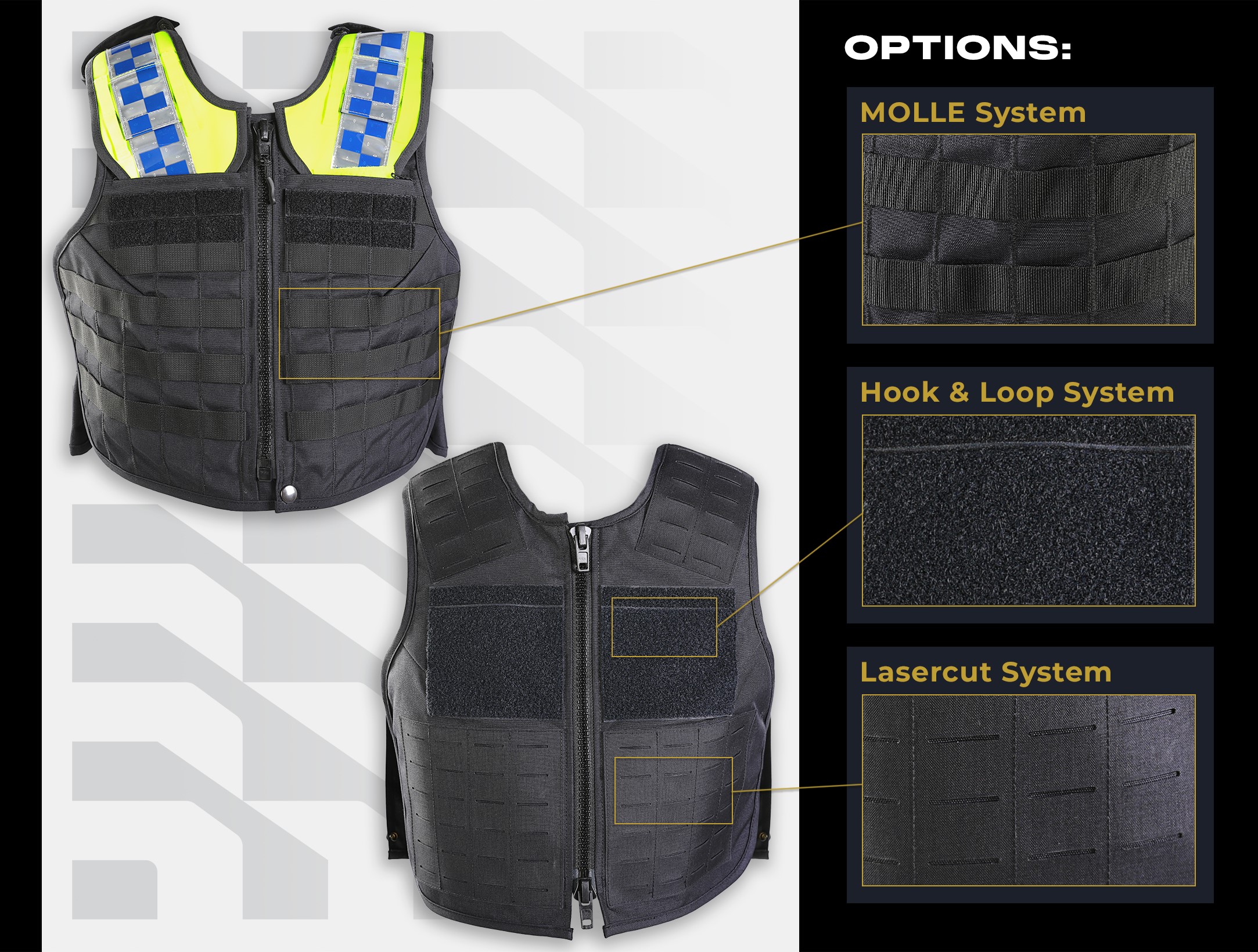 MOLLE (Modular Lightweight Load-carrying Equipment): The Molle system consists of horizontal loops attached to the outside of the protective vest, enabling flexible attachment of pouches or holsters. The advantage of this system is its versatility, allowing equipment such as handcuffs, radios or magazine pouches to be attached to different parts of the vest. Larger and heavier items can also be securely attached as the MOLLE loops are robust and durable. However, this system can increase the weight of the vest due to additional seams and loops, and it can take longer to attach equipment, which may be less practical in stressful situations.