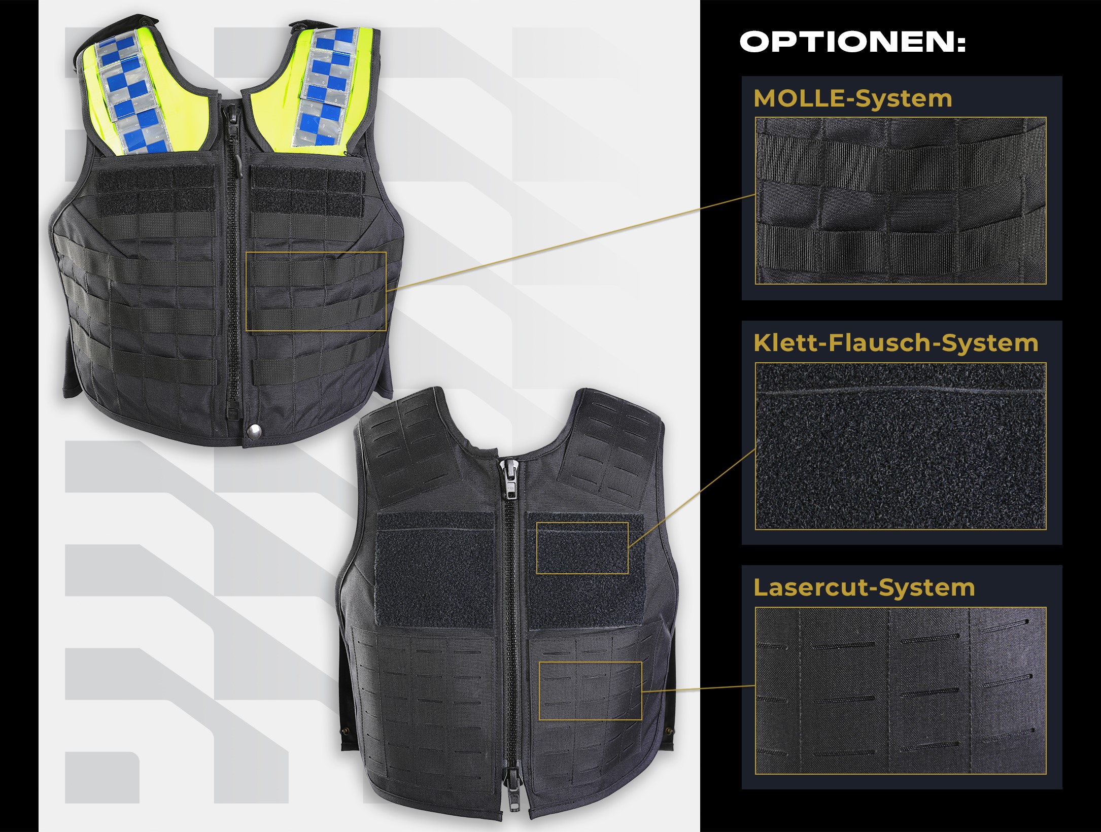 Moderne Schutzwesten bieten verschiedene Anpassungsmöglichkeiten und Aufrüstungen, die insbesondere für Strafverfolgungsbehörden wichtig sind, da diese oft zusätzliche Ausrüstungsgegenstände wie Handschellen, Funkgeräte oder Magazintaschen mitführen müssen. Zu den gängigsten Befestigungssystemen gehören das MOLLE-System, das Klett-Flausch-System und das Laser-Cut-Design. Jedes dieser Systeme bietet spezifische Vor- und Nachteile, die je nach Einsatzbedingungen gewählt werden können.