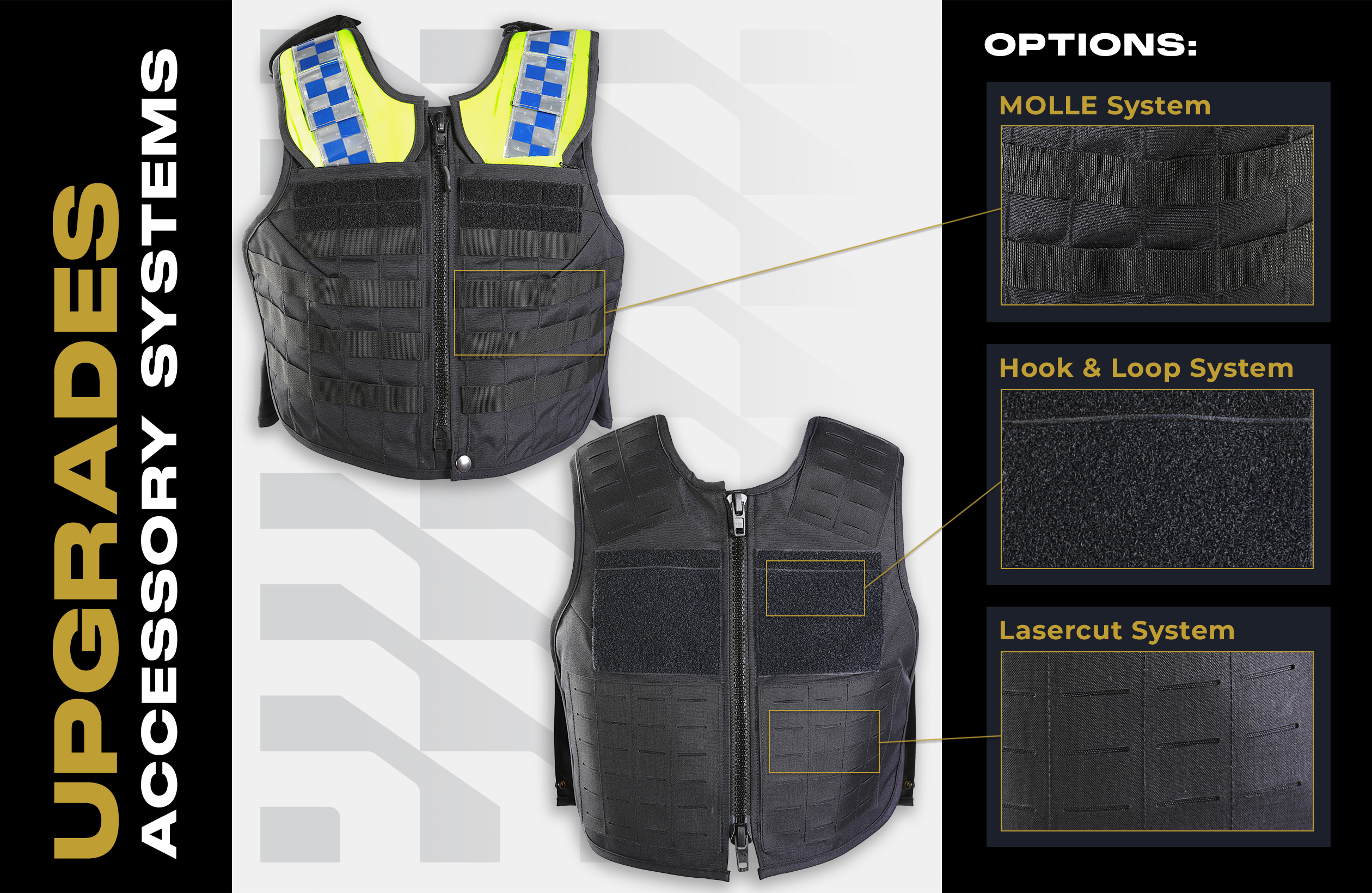 MOLLE (Modular Lightweight Load-carrying Equipment) : le système MOLLE se compose de boucles horizontales fixées à l’extérieur du gilet de protection, permettant la fixation flexible de pochettes ou d’étuis. L’avantage de ce système est sa polyvalence : il permet de fixer des équipements tels que des menottes, des radios ou des porte-chargeurs sur différentes parties du gilet. Des objets plus gros et plus lourds peuvent également être fixés en toute sécurité, car les boucles MOLLE sont robustes et durables. Cependant, ce système peut augmenter le poids du gilet en raison des coutures et des boucles supplémentaires. La fixation du matériel peut également prendre plus de temps et s’avérer moins pratique dans des situations tendues.